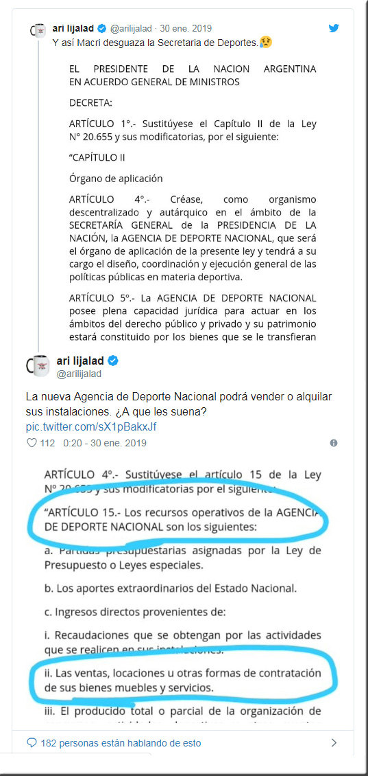 El DNU construido entre el ahora director de la agencia, Diógenes de Urquiza, y el asesor del macrismo Fernando Marín (conocido por haber destruido a Racing con el gerenciamiento de Blanquiceleste S.A.) golpea de lleno en la Ley del Deporte (20.655) permitiendo además de la venta y privatización de los bienes estatales el arancelamiento de programas y actividades.