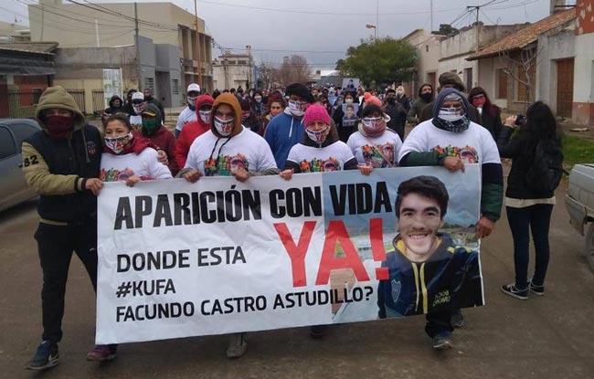 Facundo Astudillo Castro, de 22 años, militaba en la agrupación Jóvenes con Memoria de Villarino, asociada a la denuncia de casos de violencia institucional. Hincha de Boca, había organizado junto a sus amigos una cancha donde jugar al futbol en el barrio, a la cual la policía asistía para amedrentarlos. Como en tantos otros barrios del conurbano, donde un arma en la mano es pretexto suficiente para imponer la ley del más fuerte. Ese, el más fuerte, el pasado 30 de abril esposó a Facundo y lo subió a un patrullero, cuando iba rumbo a Bahía Blanca desde su Pedro Luro natal, alrededor de las 16 horas. Nunca más se lo volvió a ver. Desde ese mismo momento, su madre, Cristina Castro ha insistido en el único dato certero que hay respecto de su paradero: la Bonaerense es la responsable.